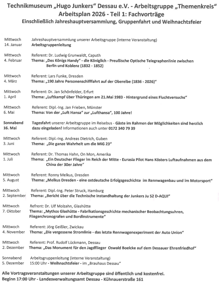 unsere monatlichen Vortragsveranstaltungen finden in der Regel jeweils am 1. Mittwoch im Monat um 17.00 Uhr in der Landesverwaltungsamt Dessau in der Kühnauerstraße 161 statt. Jeder ist zu diesen interessanten und lehrreichen Veranstaltungen auch im Jahr 2025 herzlich dazu eingeladen – der Eintritt ist frei! Spenden sind willkommen.